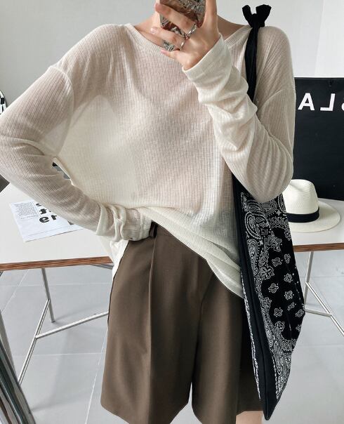 レディース トップス カットソー 長袖 Uネック スリム 細身 フェミニン ストリート 透け感 伸縮性 綿 リブニット かわいい 大人可愛い きれいめ シンプル カジュアル 上品 かっこいい レトロ アジアン エスニック こなれ感 ラフ ガーリー ルーズ 個性的 クール モード系 エレガント モダン フォーマル とろみ感 かっちり キュート ラグジュアリー アクティブ ナチュラル 無地 夏 お出かけ 女子会 休日 韓国 オルチャン コーデ プチプラ 普段使い 着回し レイヤード モテ 清楚 トレンド 流行